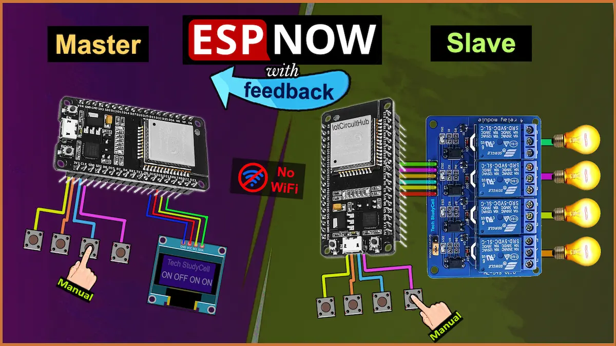 Control multiple relays wirelessly using two ESP32 boards with the ESP-NOW protocol. This ESP32 ESPNOW project demonstrates a Master-Slave configuration, where the Master sends commands to the Slave to control four relays. The system includes real-time feedback on an OLED display, manual button control on both ends, and status indication via the ESP32’s onboard LED.