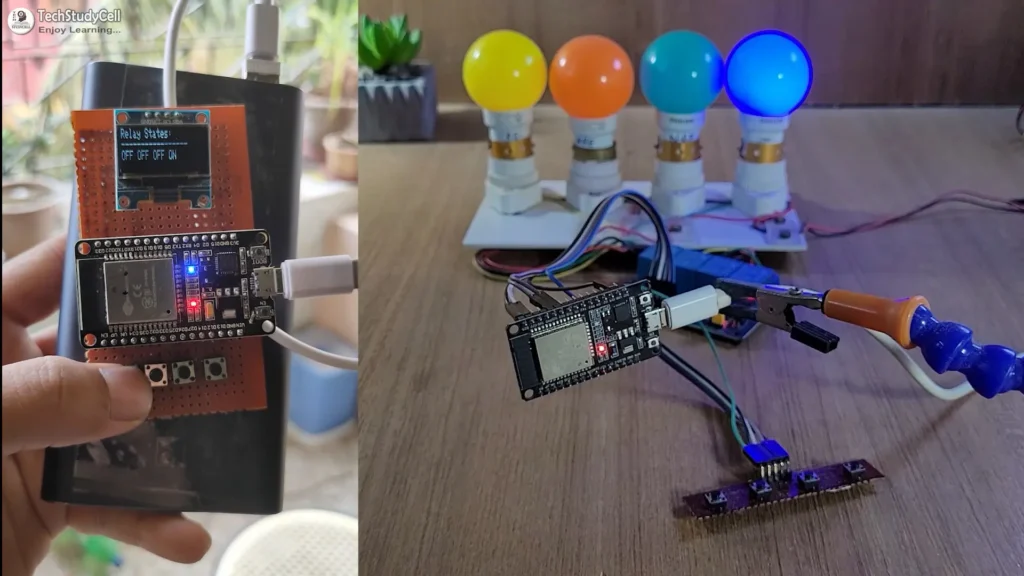 The GPIO D13, D12, D14, & D27 are connected with push buttons to control the relay module manually.