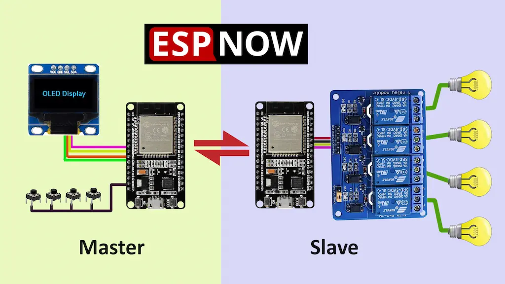 - An ESP32 Master has 4 buttons. Each button controls one of the 4 relays on the ESP32 Slave.