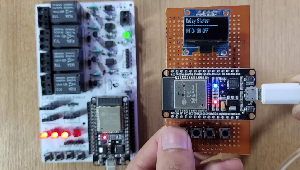 - Slave ESP32: Controls 4 relays, receives commands, and sends feedback to the Master. It also has 4 manual control buttons for local operation.