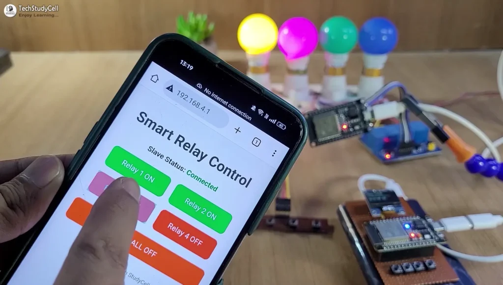This project features a built-in web server on the ESP32 master, allowing relay control from a mobile device over Wi-Fi. This extends the effective control range beyond ESP-NOW’s limit, as long as the mobile stays connected to the master’s Wi-Fi network.