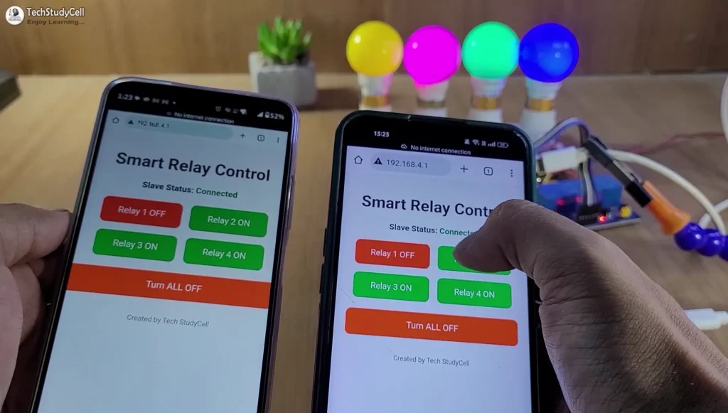 | HTML UI | Dynamically shows relay states and Slave status (via JSON updates every 2s). |