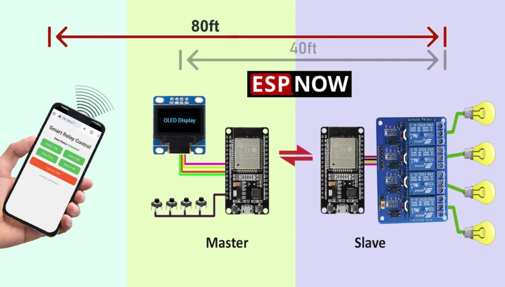 In this project, we demonstrate how to build a reliable and wireless home automation system using two ESP32 boards. One acts as the ESP-NOW master, and the other as the ESP-NOW slave. You can control 4 relays wirelessly via ESP-NOW protocol, and also monitor and control them from a built-in web server interface hosted in Access Point (AP) mode on the master ESP32. An OLED display provides real-time feedback on relay states, and an onboard LED indicates slave connectivity.